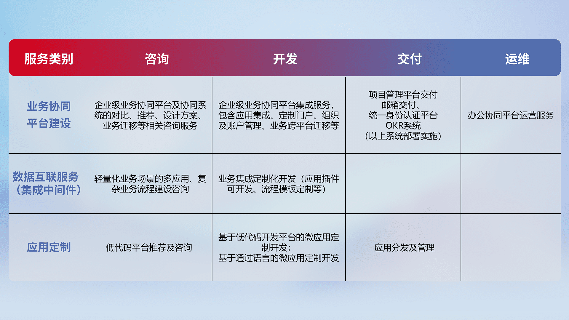 针对钉钉、、企微、、IDaas等平台级产品提供产品的规划、、、方案、、交付、、、、定制化开发等服务,,实现如统一协同办公、、、、智能客户服务、、、、混合会议管理、、、、智能数据查询、、、等业务场景,,,实现数字化转型。。。。
